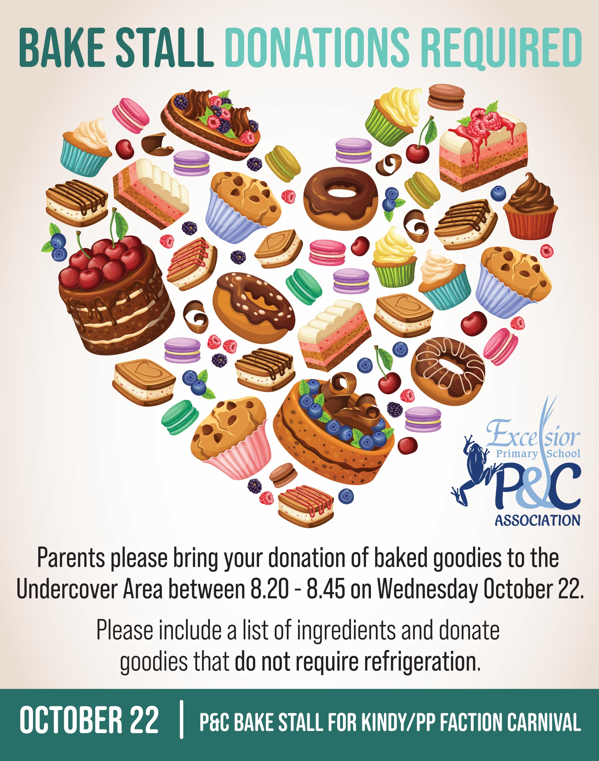 Parents please bring your donation of baked goodies to the Undercover Area between 8:20-8:45am on Wednesday 22nd October. Please include a list of ingredients and donate goodies that do not require refrigeration.
