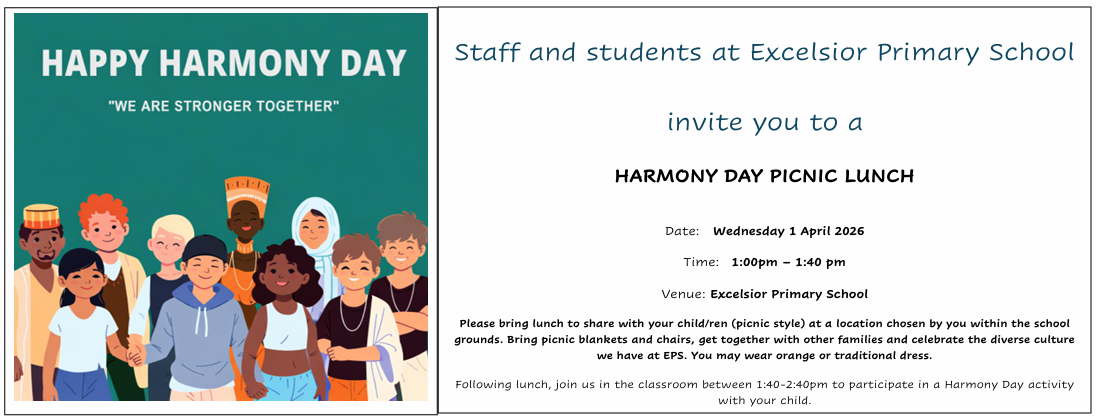 Staff and students at Excelsior Primary School invite you to our Harmony Day Picnic Lunch Time - 1:00pm - 1:40pm Please bring a lunch to share with your child/ren (picnic style) at a location chosen by you within the school grounds. Bring picnic blankets and chairs, get together with other families and celebrate the diverse ... Read more |