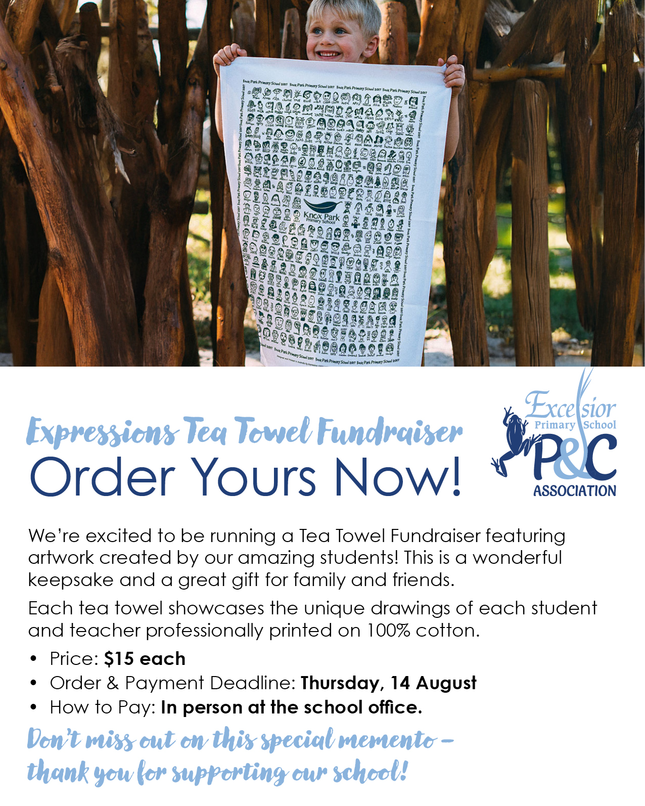 Dear Parent/Caregiver, Excelsior Primary School is running a Tea Towel Fundraiser to raise money for our P & C. Our limited-edition Tea Towel design will be made up of self-portraits drawn by all our children and staff. Just like a yearbook on a tea towel. The pictures and names will be arranged all together as ... Read more